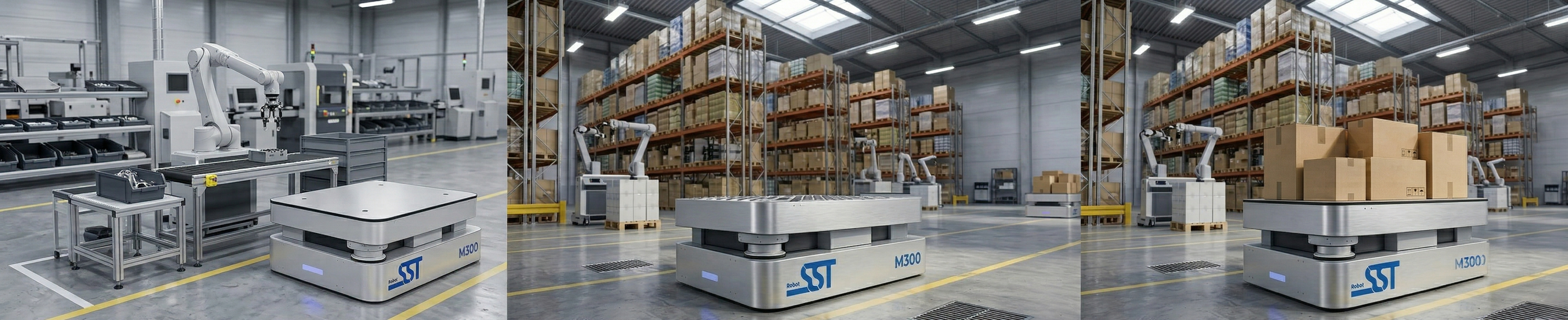 SST Robot’s autonomous guided AMR Shuttle M300 is designed for material handling in warehouses and factories. It is also used as a starting platform for composite robots and customizable robots; it is the scalable platform for the industrial world and logistics warehouses, moving carts and cart trains.